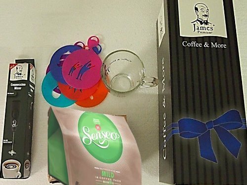 bieten Senseo Mild 16 Pads + 6 Schablonen + Capuccino Mixer + Design Glastasse von James Premium® im Geschenkkarton verpackt !